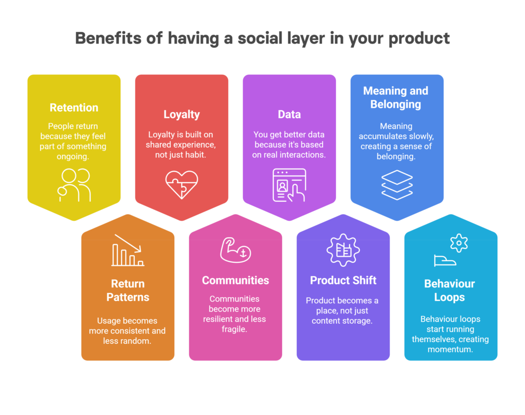 The core misunderstanding: a social layer isn’t a tool checklist. It’s how the product gets built so people can see each other, respond, build shared context, keep coming back.