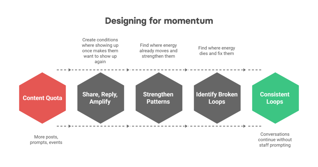 This is the opposite of intensity. Many teams burn out pushing posts and hosting events, trying to manufacture enthusiasm. Great communities don’t run on intensity. They run on consistency. Small, reliable loops that keep moving even during slow periods.