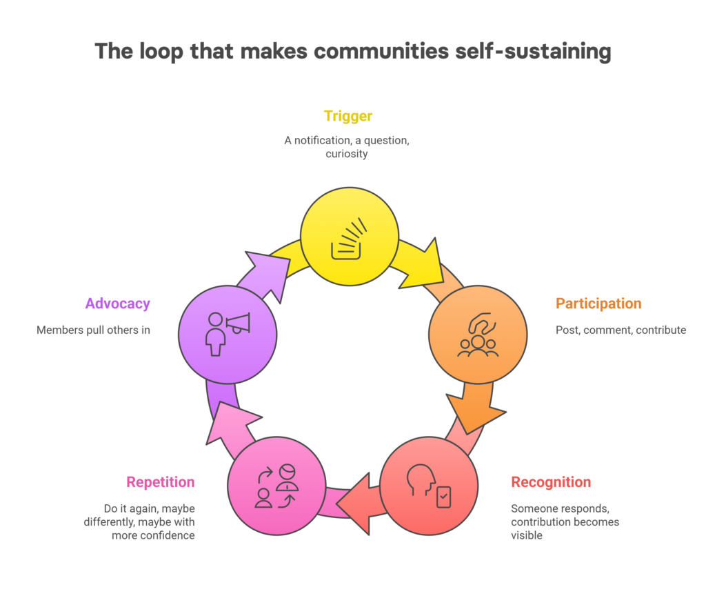 Not content calendars or engagement tactics, but actual behavioural loops where one person’s action sparks another’s, creating momentum that doesn’t need constant manual effort to survive. That’s the quiet difference between communities that grow and communities that exhaust their teams trying to keep them alive.