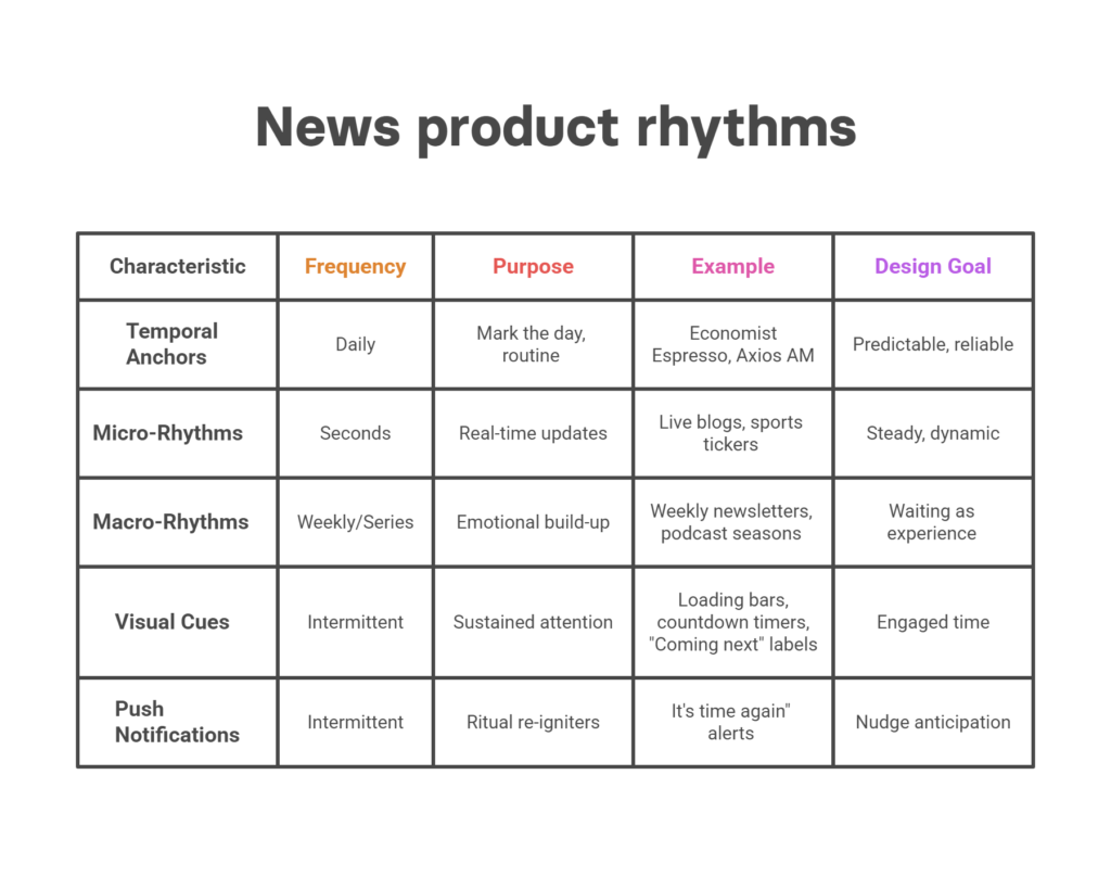 Every product has a rhythm. Most newsrooms treat design as a visual problem when it’s really a temporal one. How often and when your product delivers value matters just as much as what it delivers. You’re designing the timing, not just the screen.